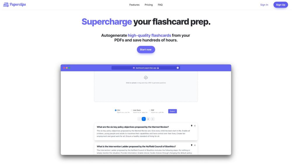 Paperclips is a web application utilizing Artificial Intelligence to generate flashcards from class notes or internet content.