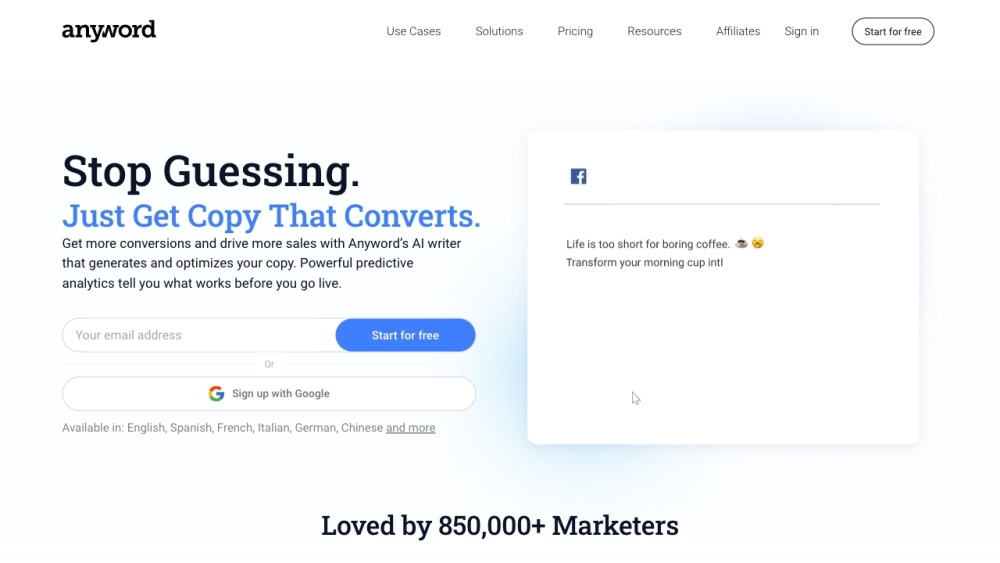 Anyword is a solution using Artificial Intelligence for marketers to produce large amounts of content that matches their brand.