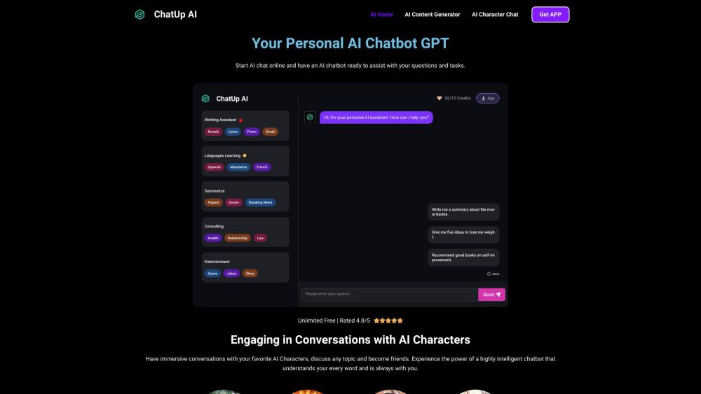 Begin a conversation online with ChatUp AI and interact with your customized AI companion GPT. Engage in discussions with AI Characters.