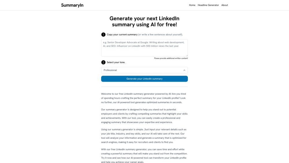 An innovative AI-powered tool instantly generates polished summaries for LinkedIn profiles.