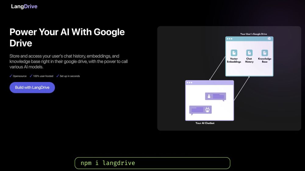 Securely store, access, and manage your AI data in Google Drive with LangDrive's direct Large Language Model integration.