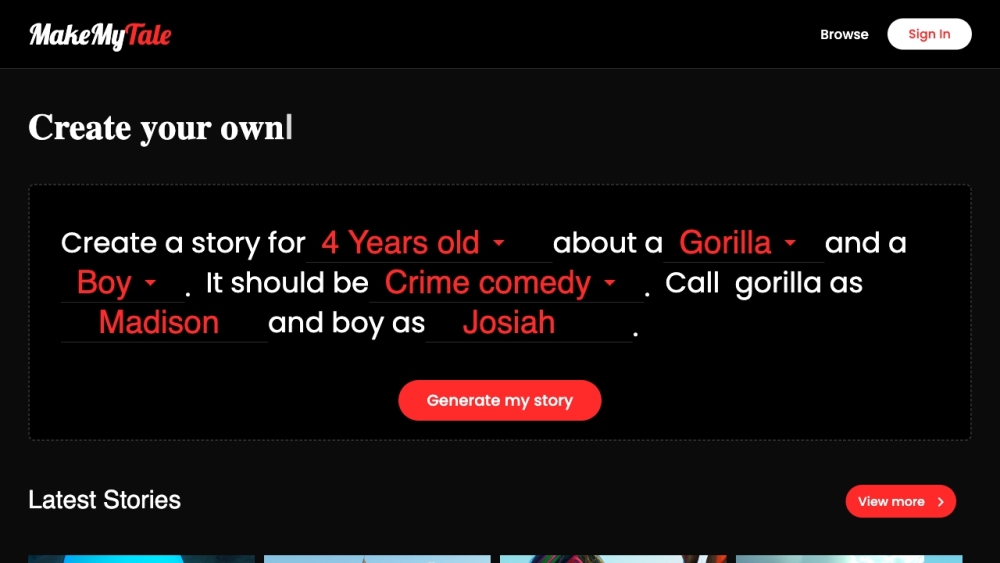 MakeMyTale is a digital storytelling platform powered by Artificial Intelligence that lets kids create and share their own stories.
