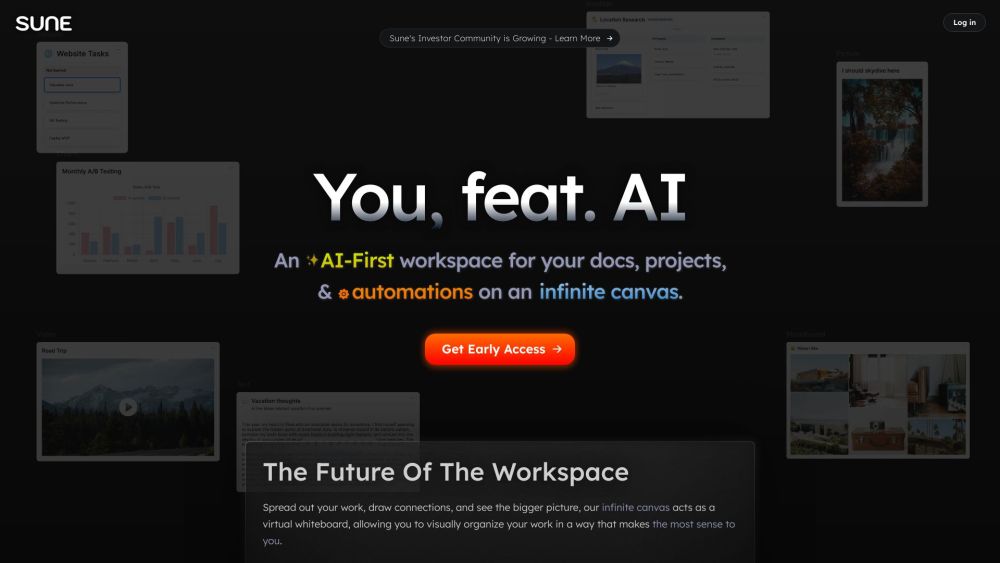 Sune, an AI-first workspace, provides an endless canvas for visually arranging tasks and boosting overall productivity.