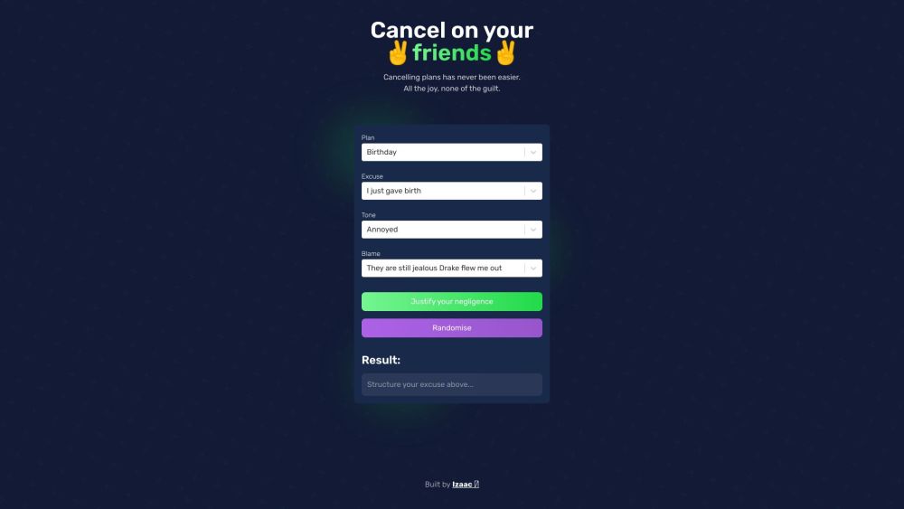 A stress-free way to cancel plans with friends, providing multiple reasons and personalized choices.
