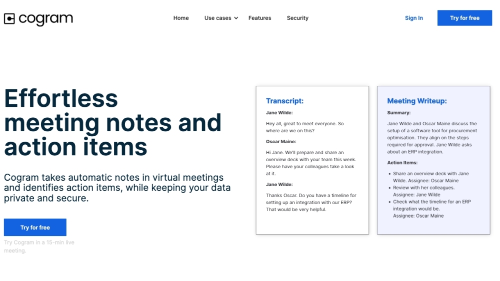 Cogram is an AI-powered tool that enhances team efficiency by documenting meetings, managing tasks, and maintaining data protection.