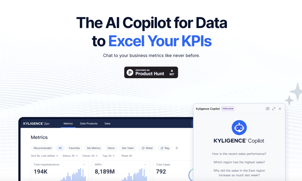 Kyligence Copilot is an AI-powered tool that assists in examining key performance indicators, creating business summaries, and offering recommendations.