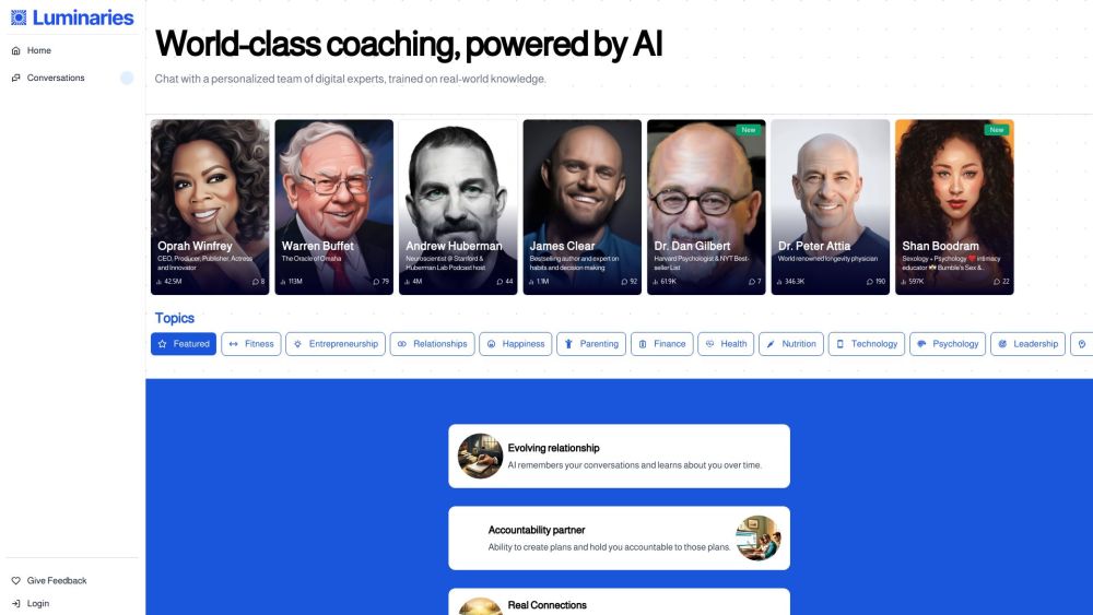 Luminaries provides coaching powered by AI technology, offering personalized digital experts for conversations that feel natural.