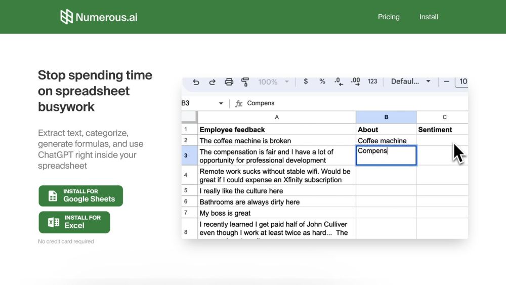 Numerous.ai is a helpful AI tool that adds ChatGPT to spreadsheets, enabling users to easily get data and use ChatGPT.