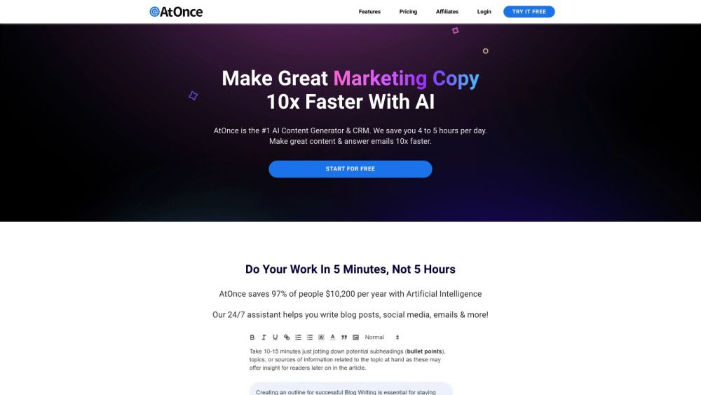 AI-powered writing tool AtOnce allows users to generate numerous SEO articles instantly.