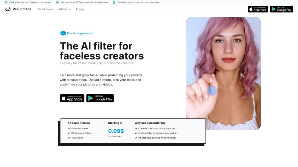Anonymity combines with self-promotion through AI-created pseudofaces.