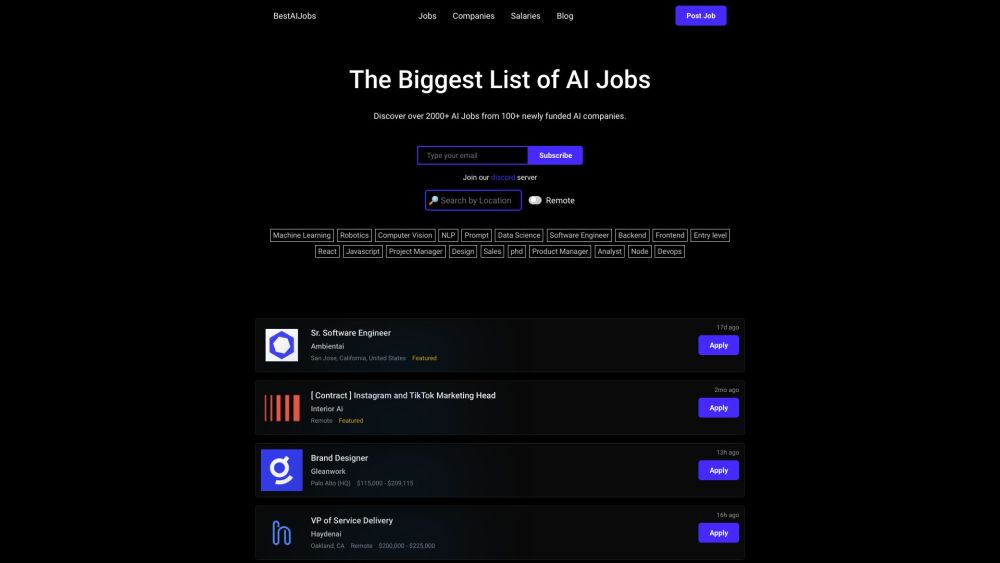 Top AI job board featuring over 2000 listings for various AI positions including engineers and developers.