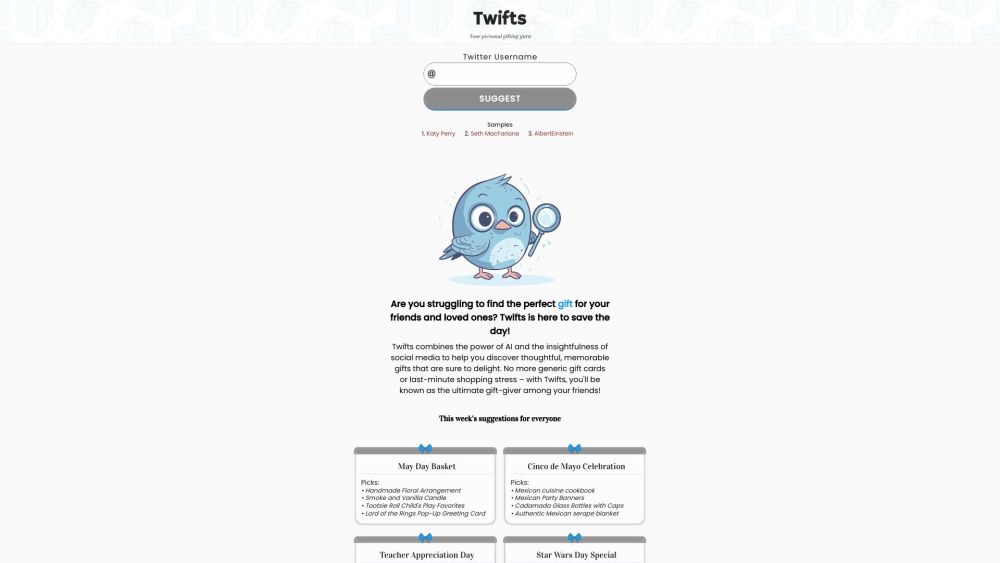 Twifts AI is a gift idea website that uses friends' Twitter posts to make customized suggestions.