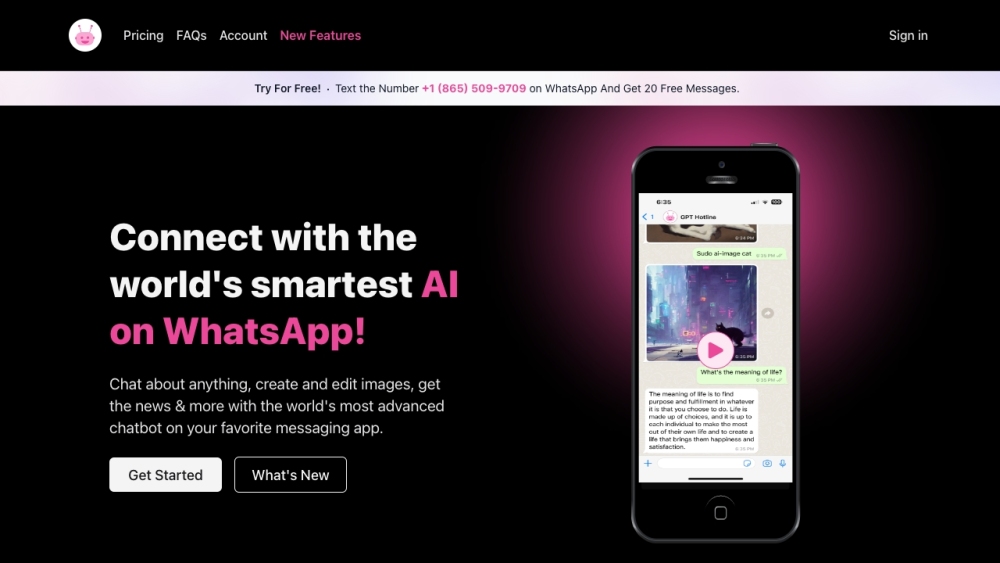 Link up with intelligent AI on WhatsApp for chatting, creating, getting news, and more.