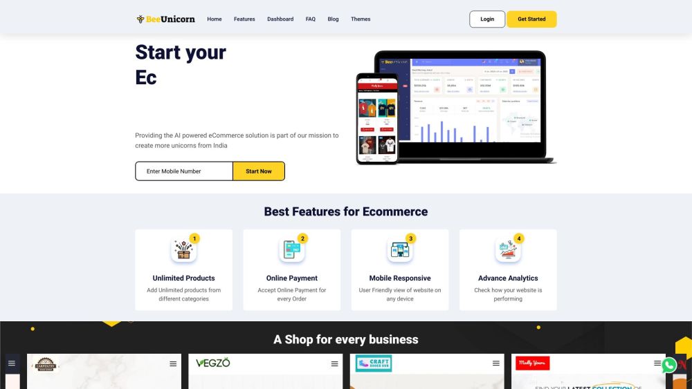 BeeUnicorn uses AI technology to provide a platform for creating and running online stores.