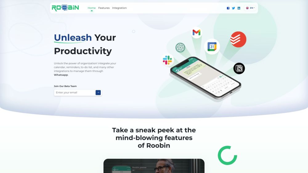 Roobin uses AI to organize tasks and has Chat GPT integration for quick answers and task assignment through WhatsApp.