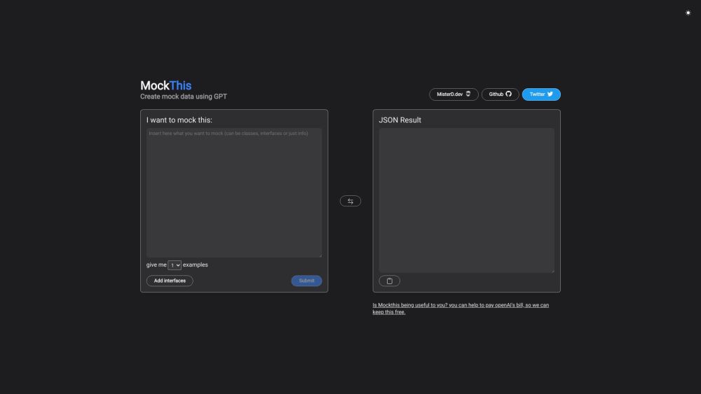 Generate mock data effortlessly using MockThis, a powerful AI-driven tool that utilizes GPT for producing authentic synthetic data.